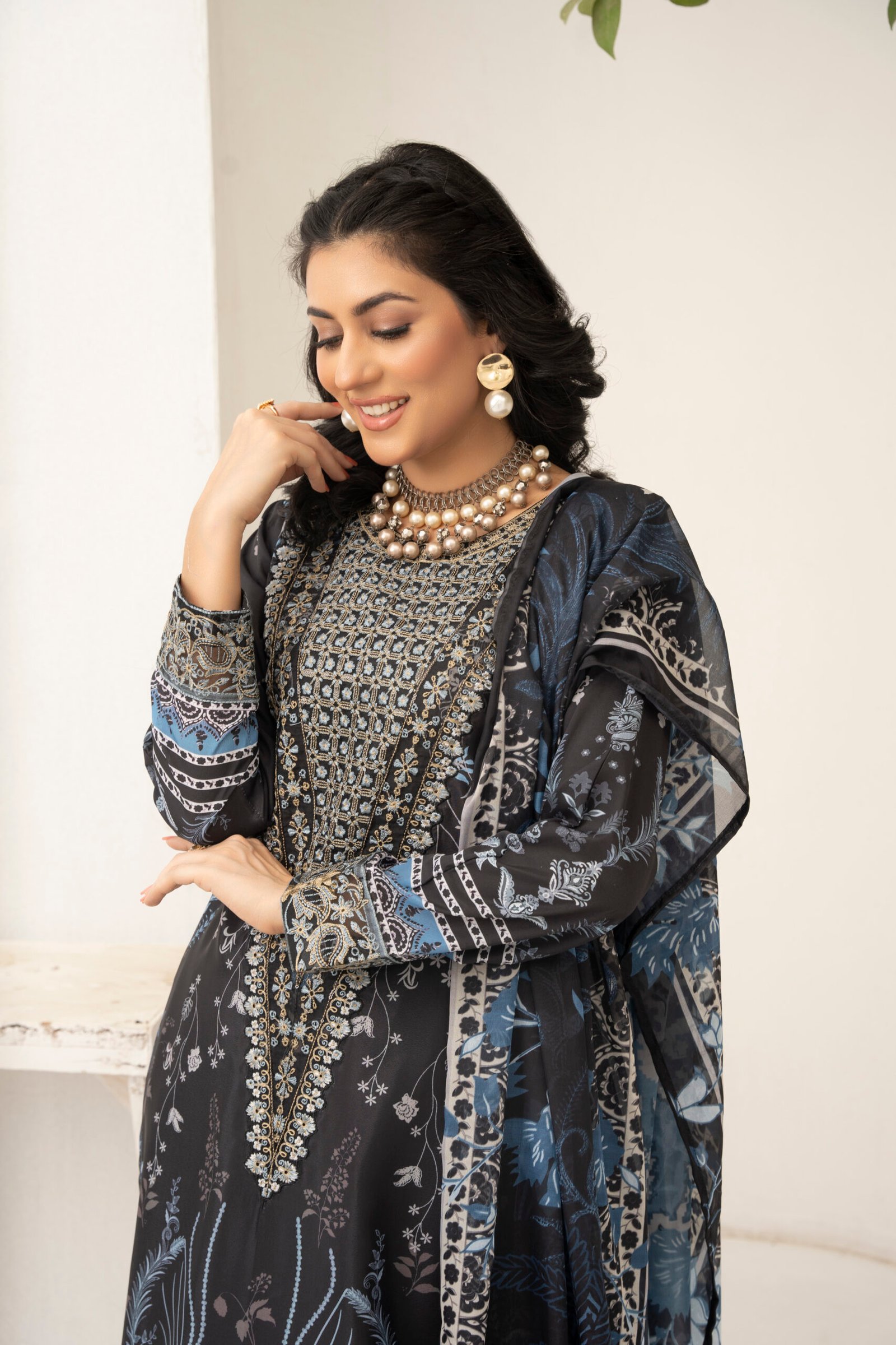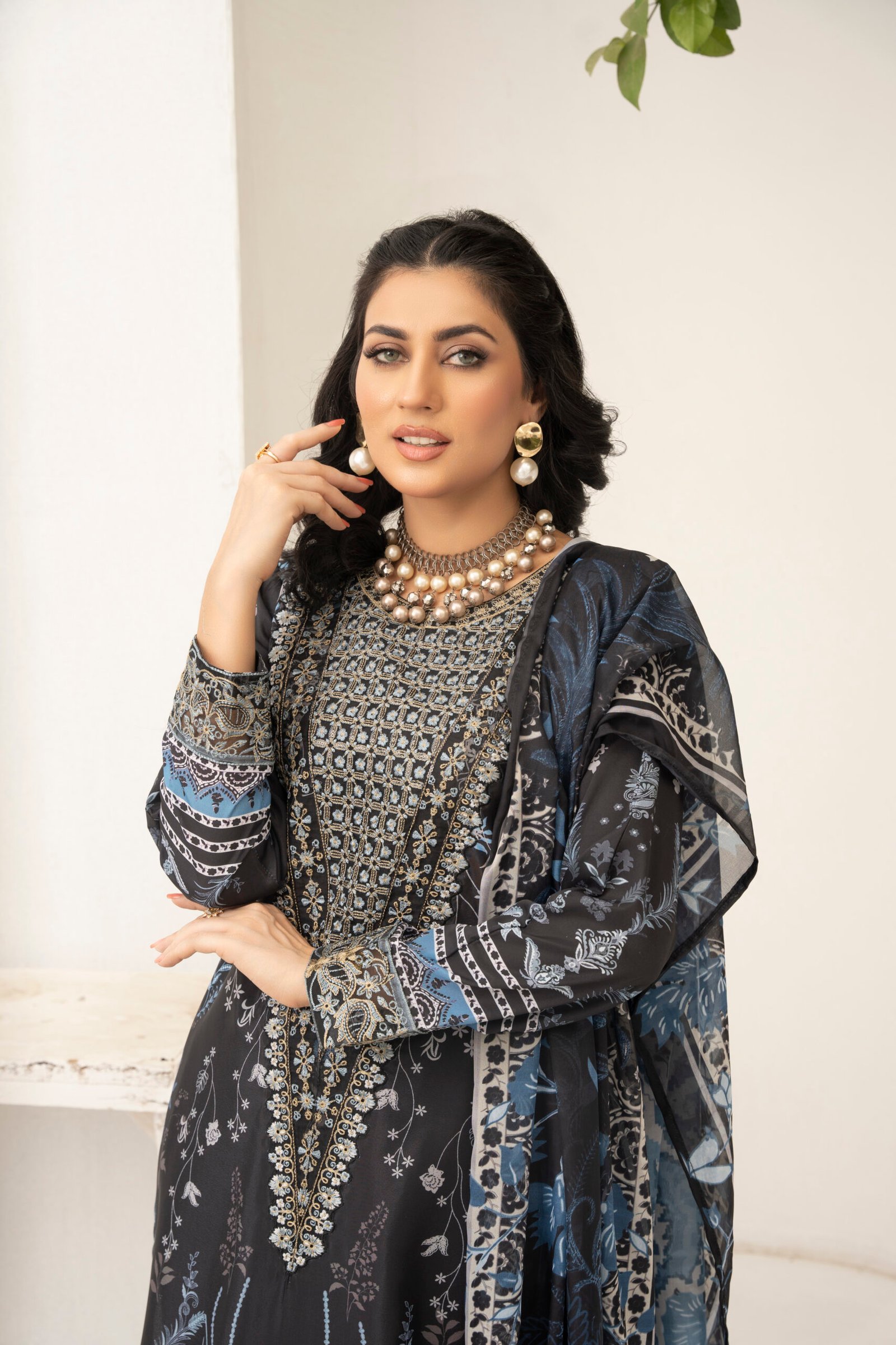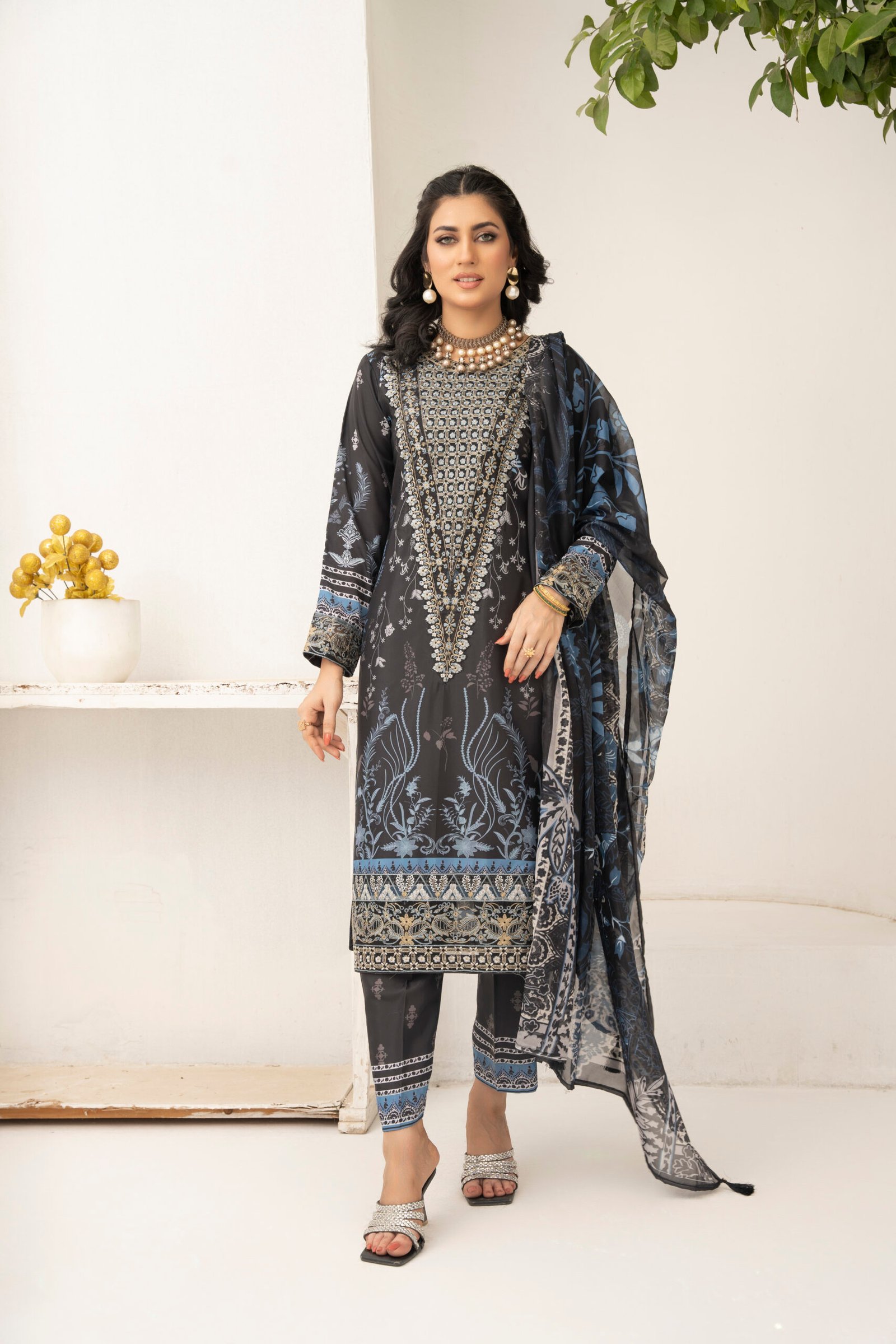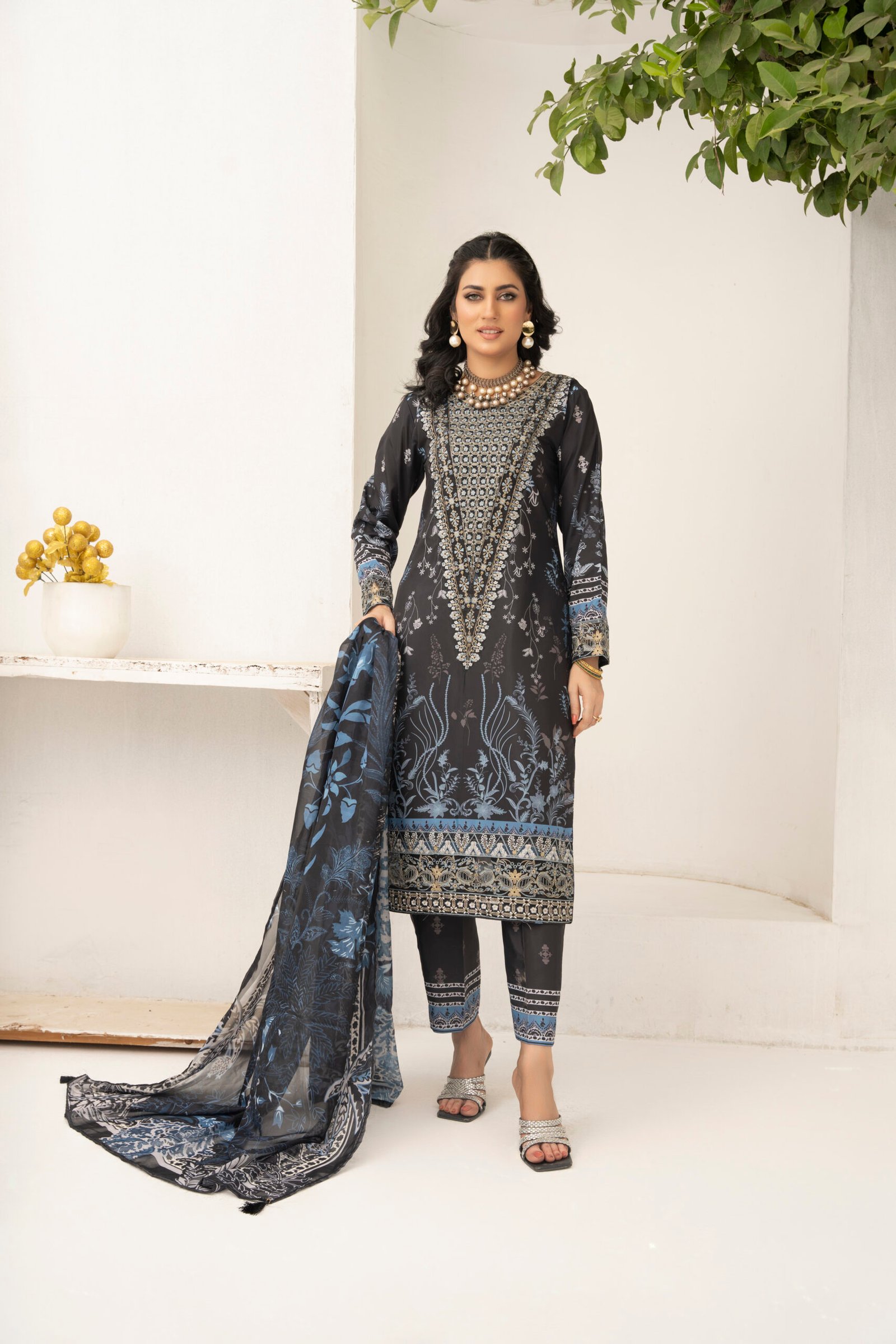 Presenting three-piece suit, crafted for those who appreciate refined style and comfort. This ensemble features a straight-cut shirt in premium grip fabric, adorned with intricate white embroidery that creates a striking and elegant look. The matching grip trouser is detailed with coordinated patterns along the hem, ensuring a seamless and polished appearance.