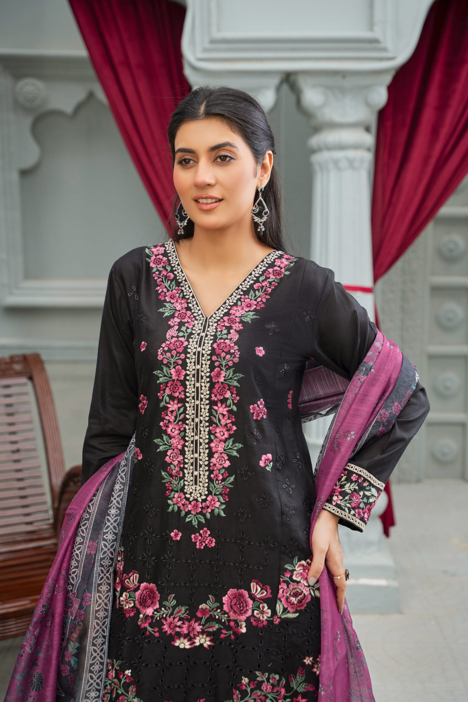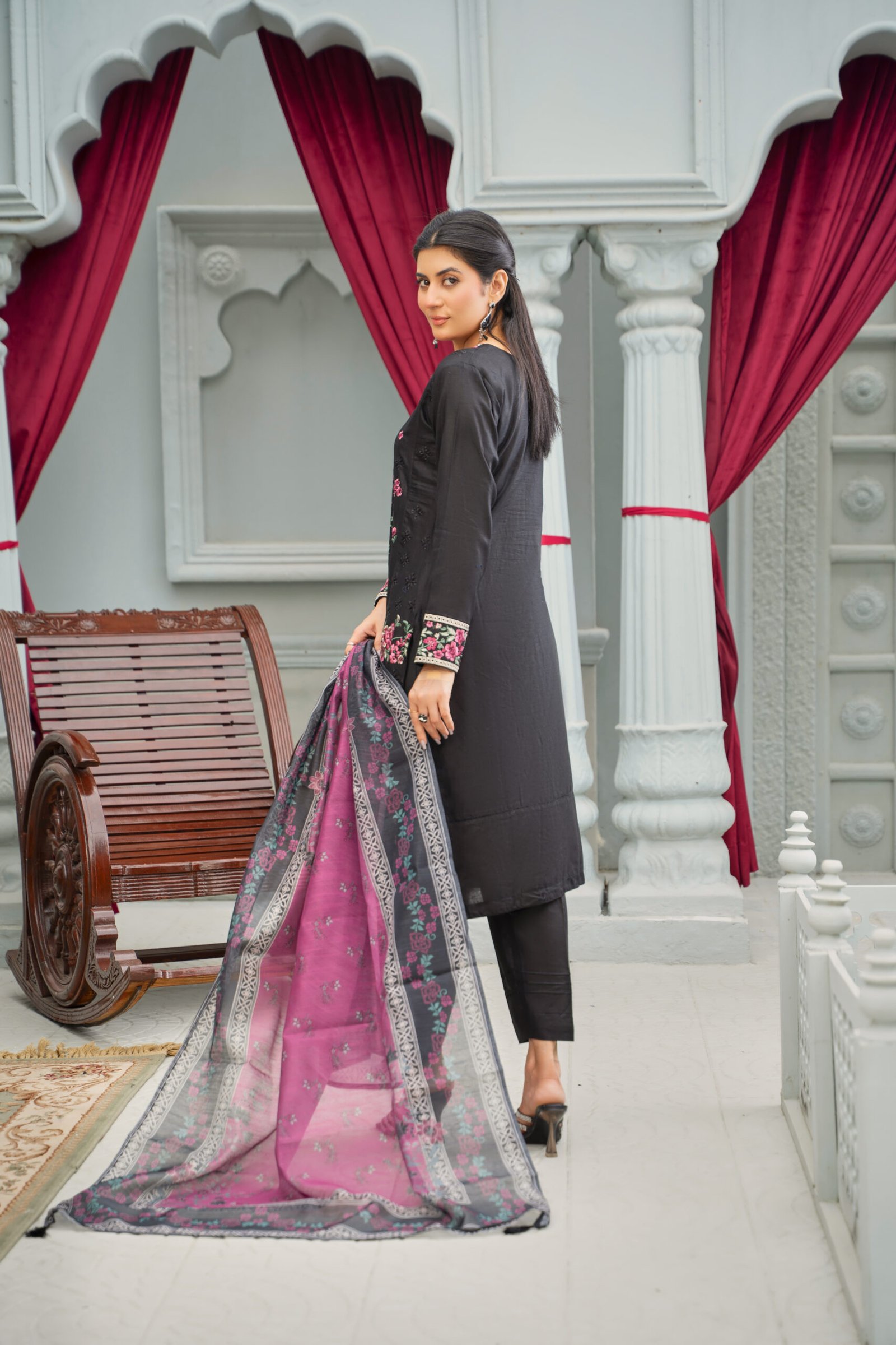 Step into timeless elegance with this stunning embroidered cotton chikankari shirt, beautifully adorned with intricate floral motifs in vibrant hues on a rich black canvas. Paired with a gorgeous printed dupatta and classic trousers, this ensemble radiates traditional charm with a touch of modern sophistication. Perfect for festive occasions or statement everyday wear, it’s crafted to celebrate your unique style. Discover this captivating look and add a graceful flair to your wardrobe- Shop NOOR at Broche for an unforgettable fashion experience.