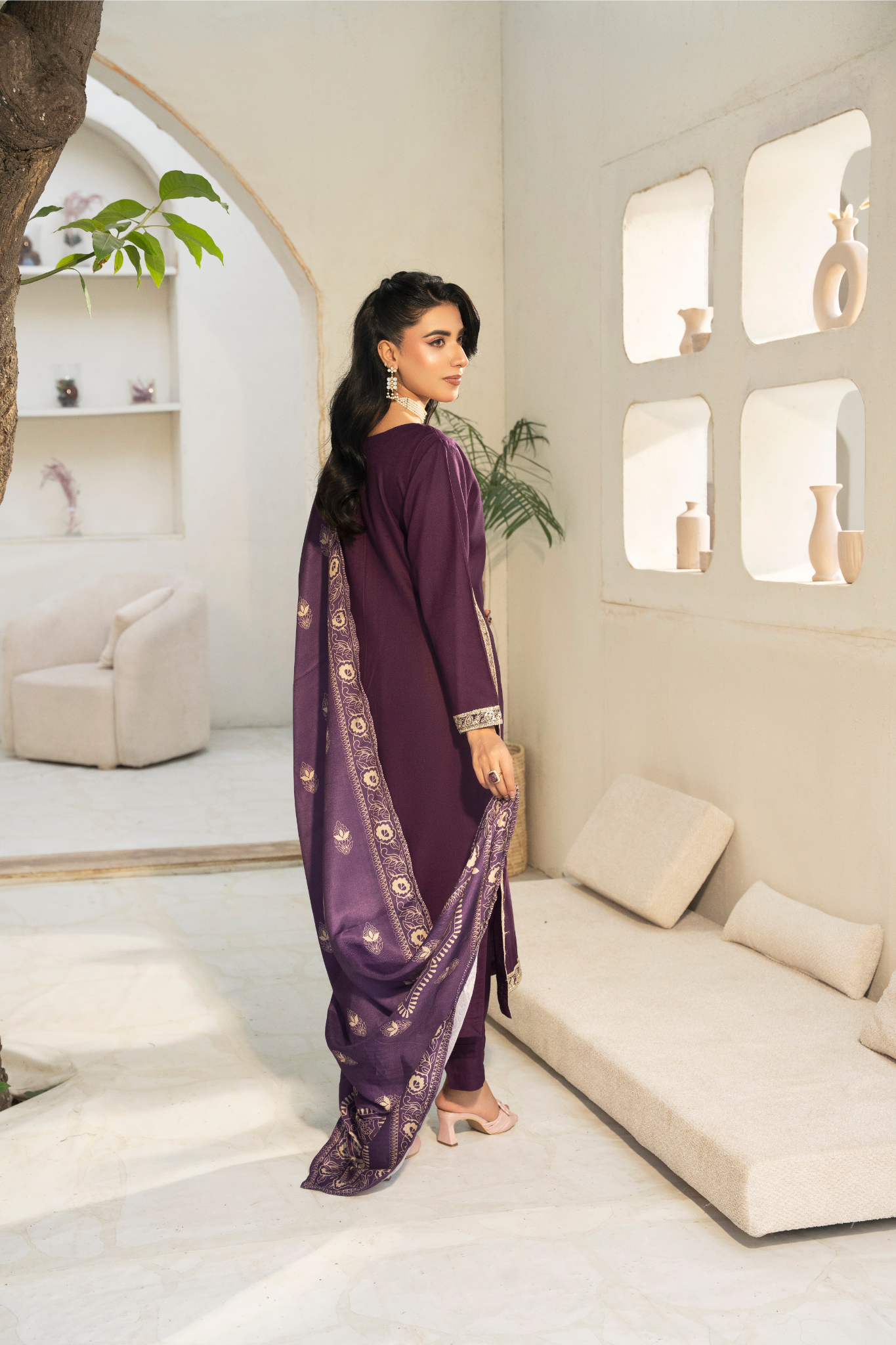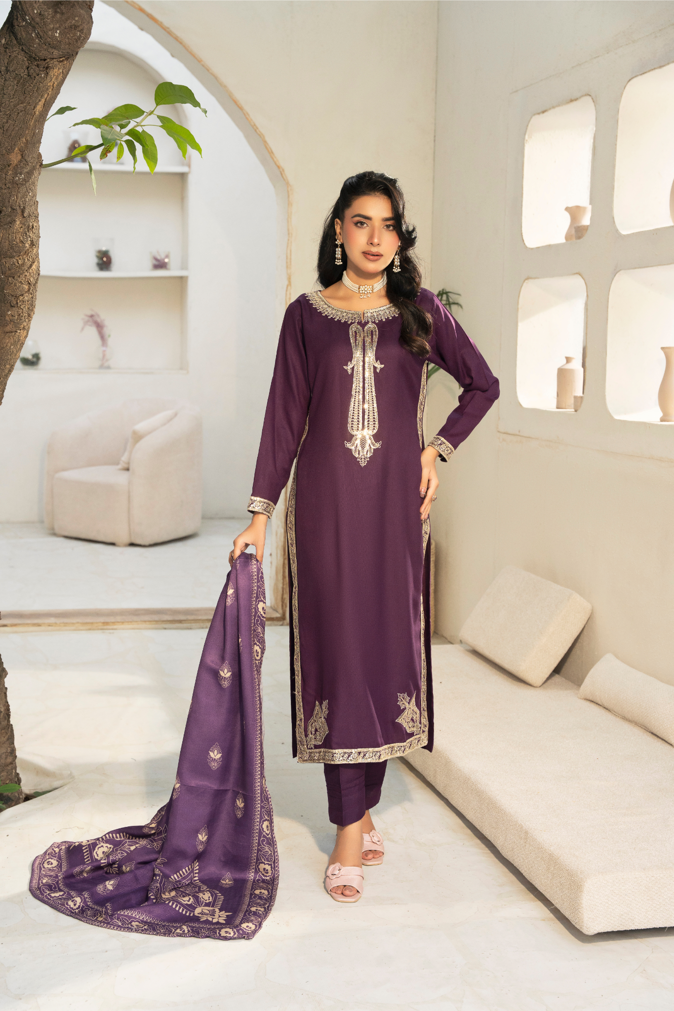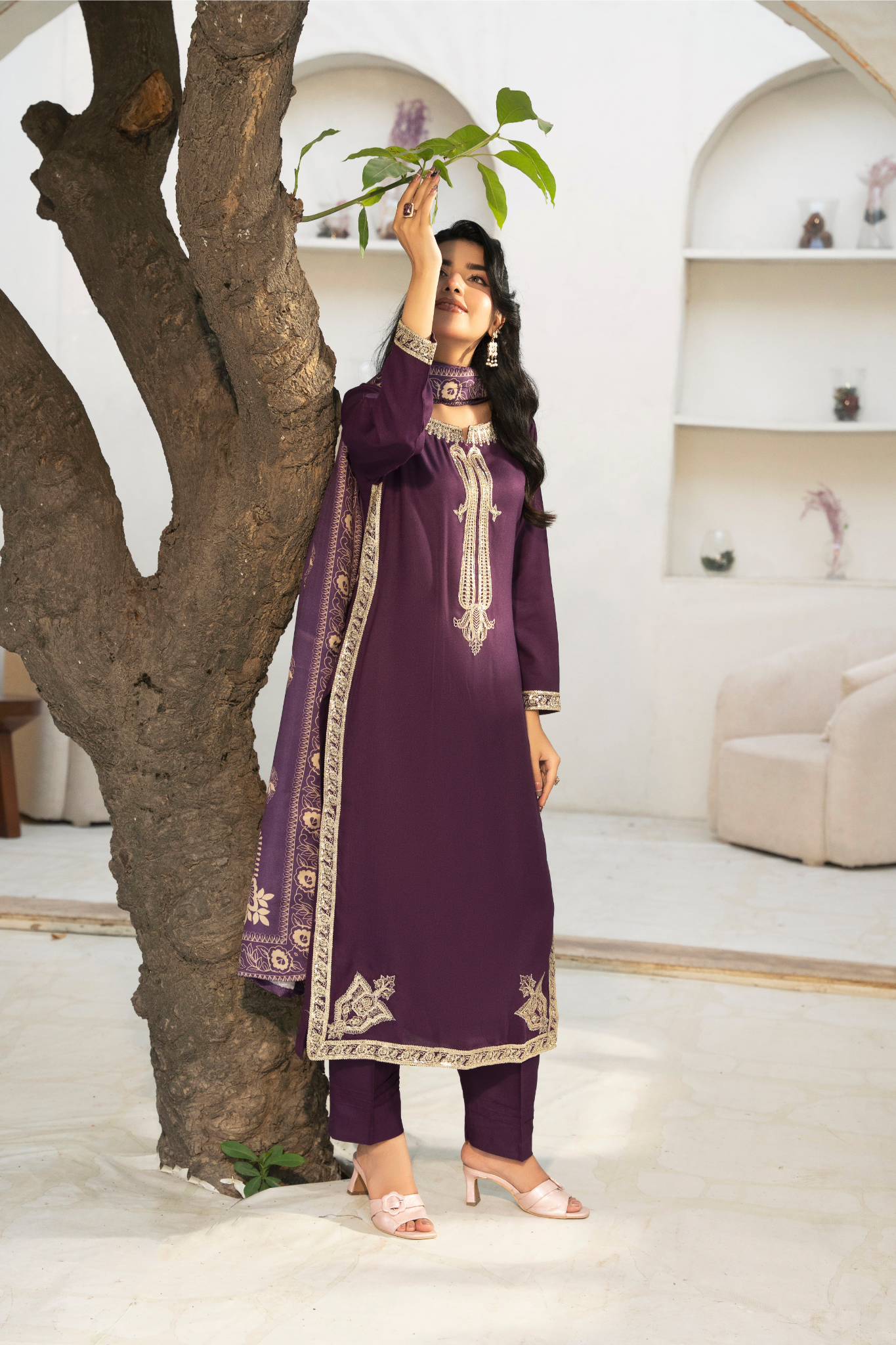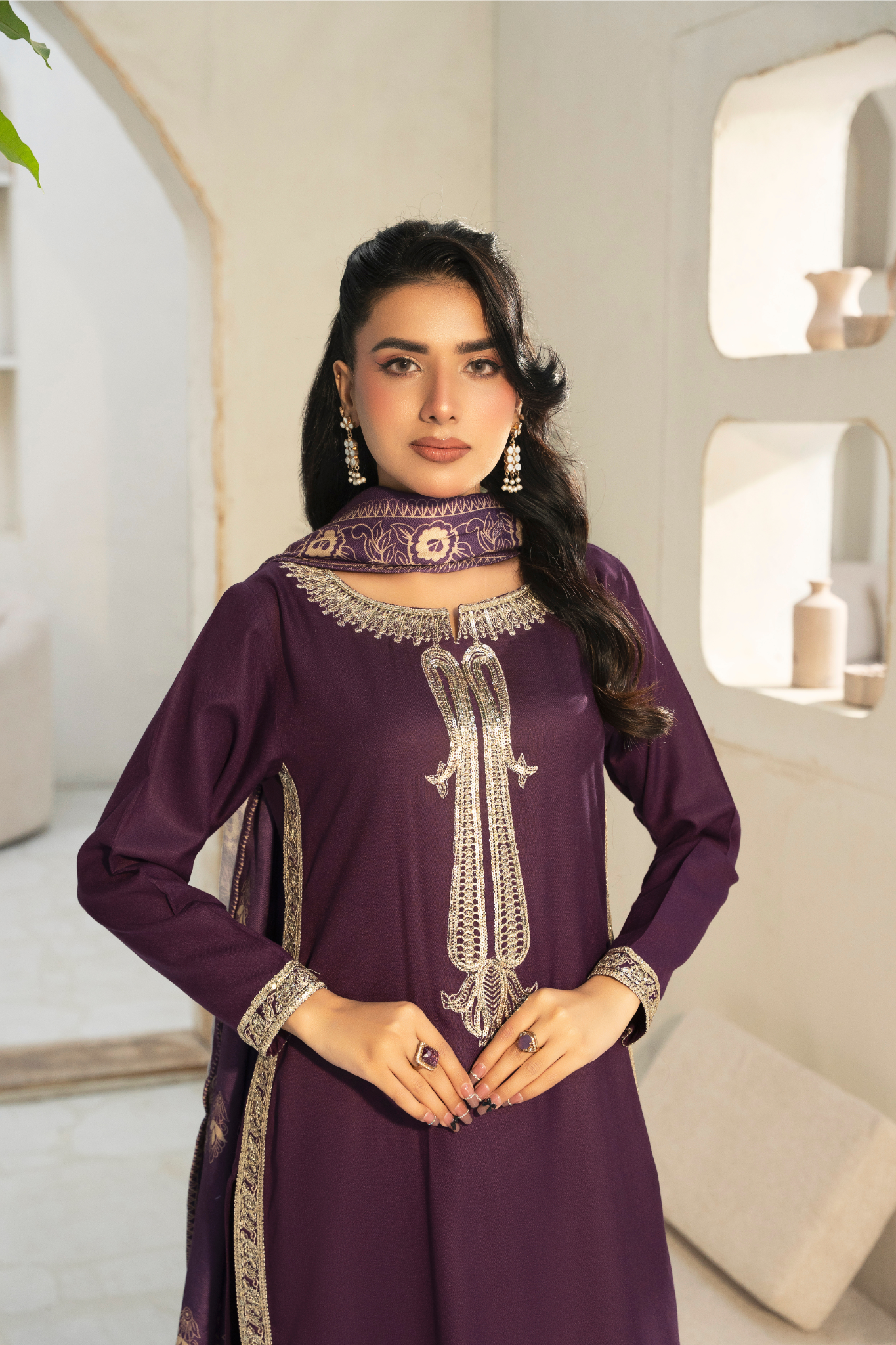 Showcasing the sophistication of our Gulal collection, this straight cut long shirt comes in a deep plum shade—exuding elegance and warmth for the winter season. Tailored from premium dhanak fabric, its silhouette is both flattering and comfortable. The shirt is adorned with gold sequin embroidery along the neckline and the sides of the hem. The borders are enhanced with detailed gold threadwork, while the matching dupatta showcases printed motifs that perfectly complement the design. Paired with slim trousers, this ensemble is the perfect blend of tradition and contemporary style, designed for festive gatherings and special occasions.