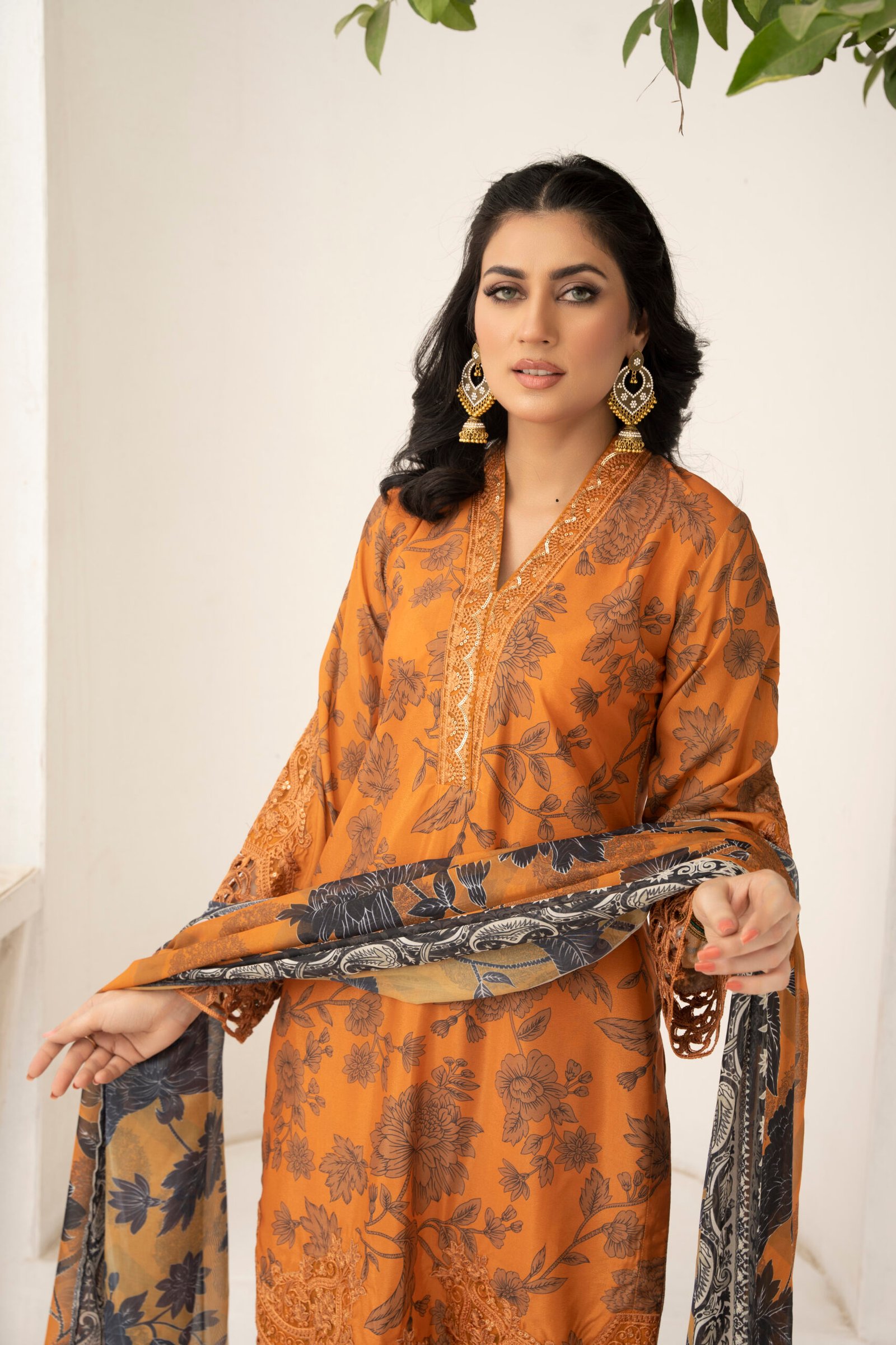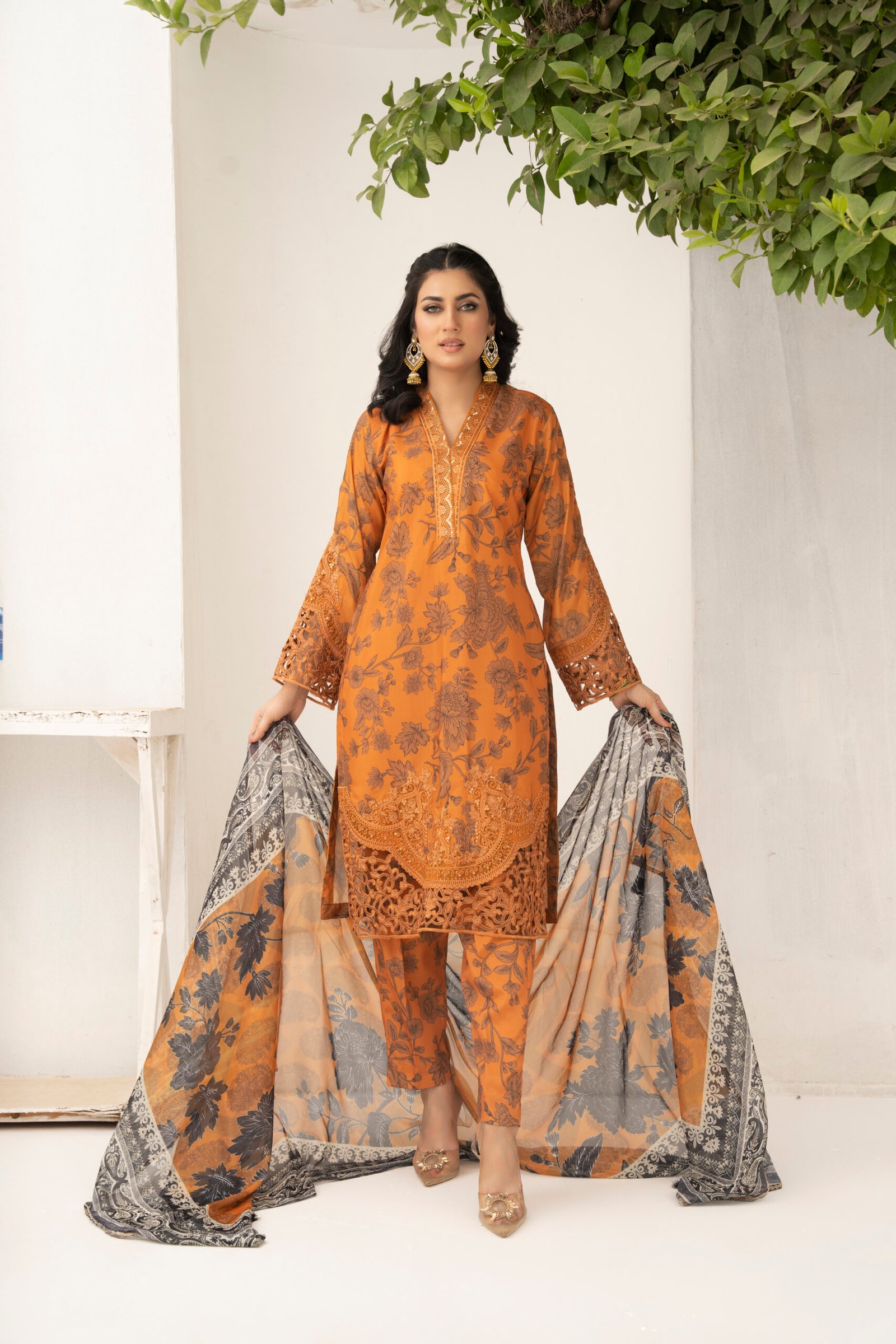 This stunning three-piece suit features a straight-cut shirt and trouser made from high-quality grip fabric. The shirt stands out with its warm burnt orange hue, beautifully adorned with intricate floral prints. Delicate lace detailing enhances the neckline, while the sleeves and hem are finished with exquisite embroidery and elegant cutwork, adding texture and sophistication to the ensemble.