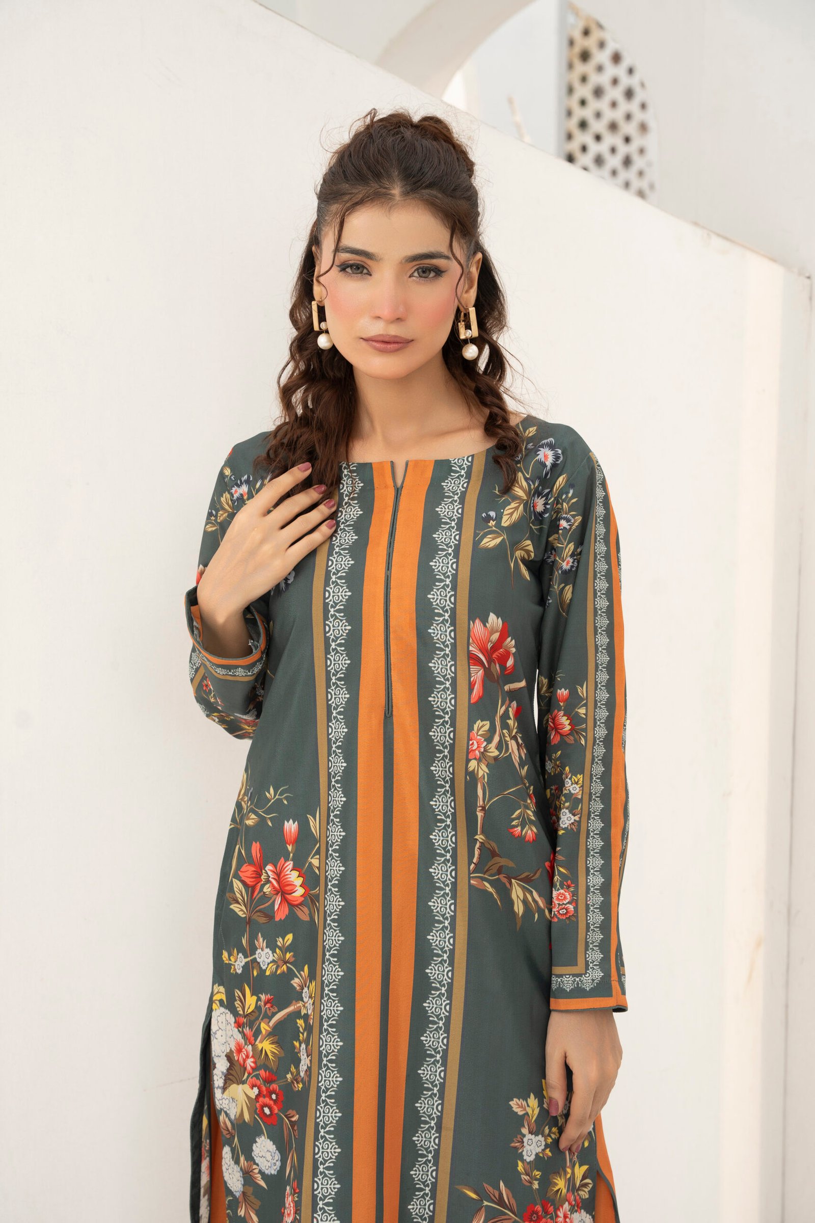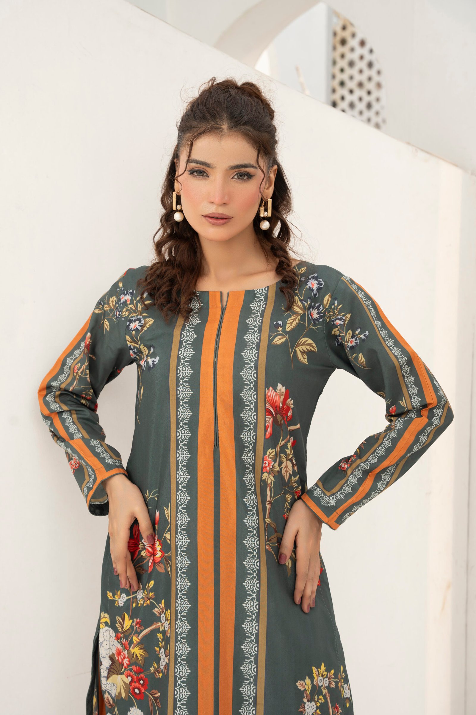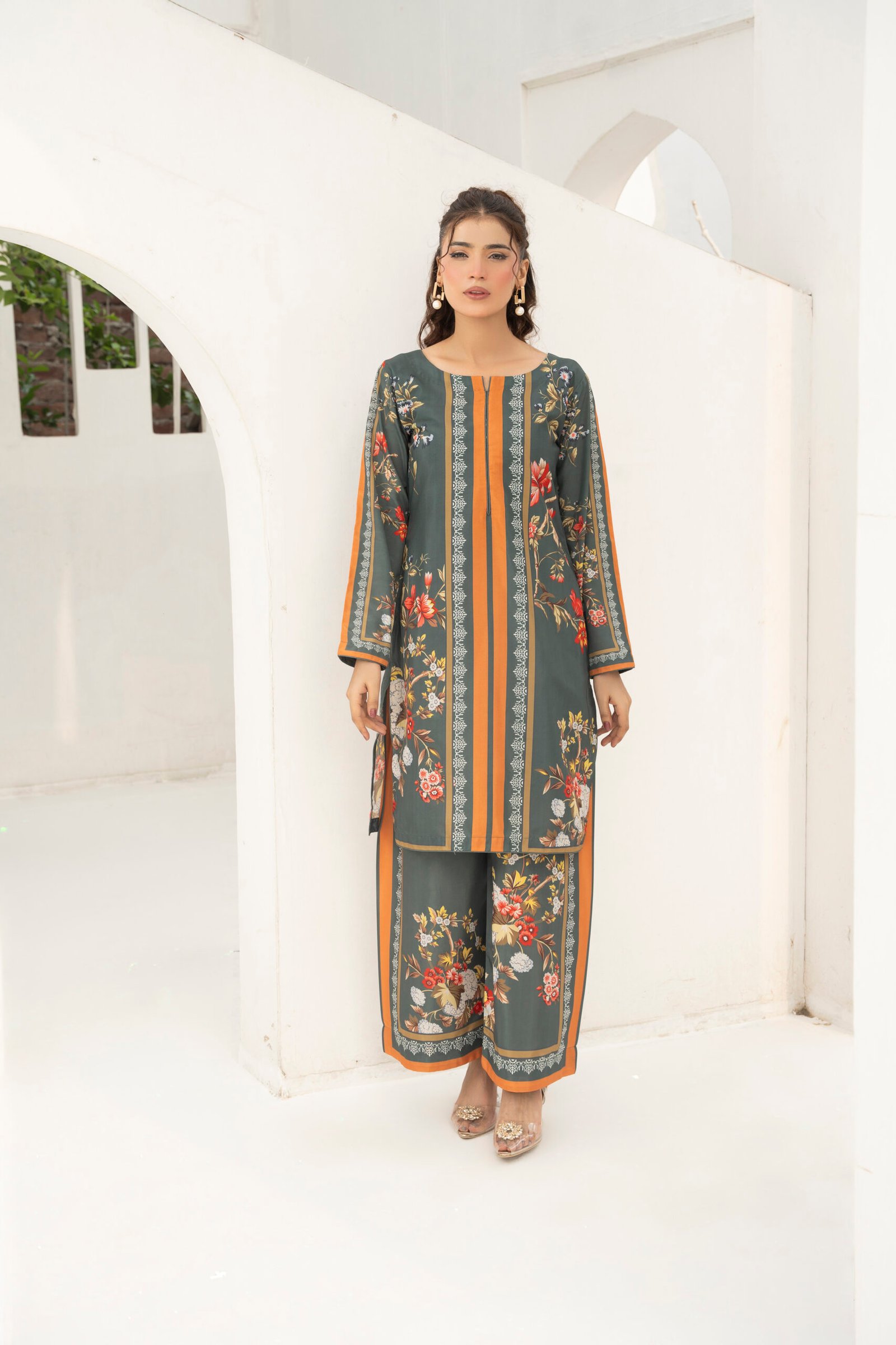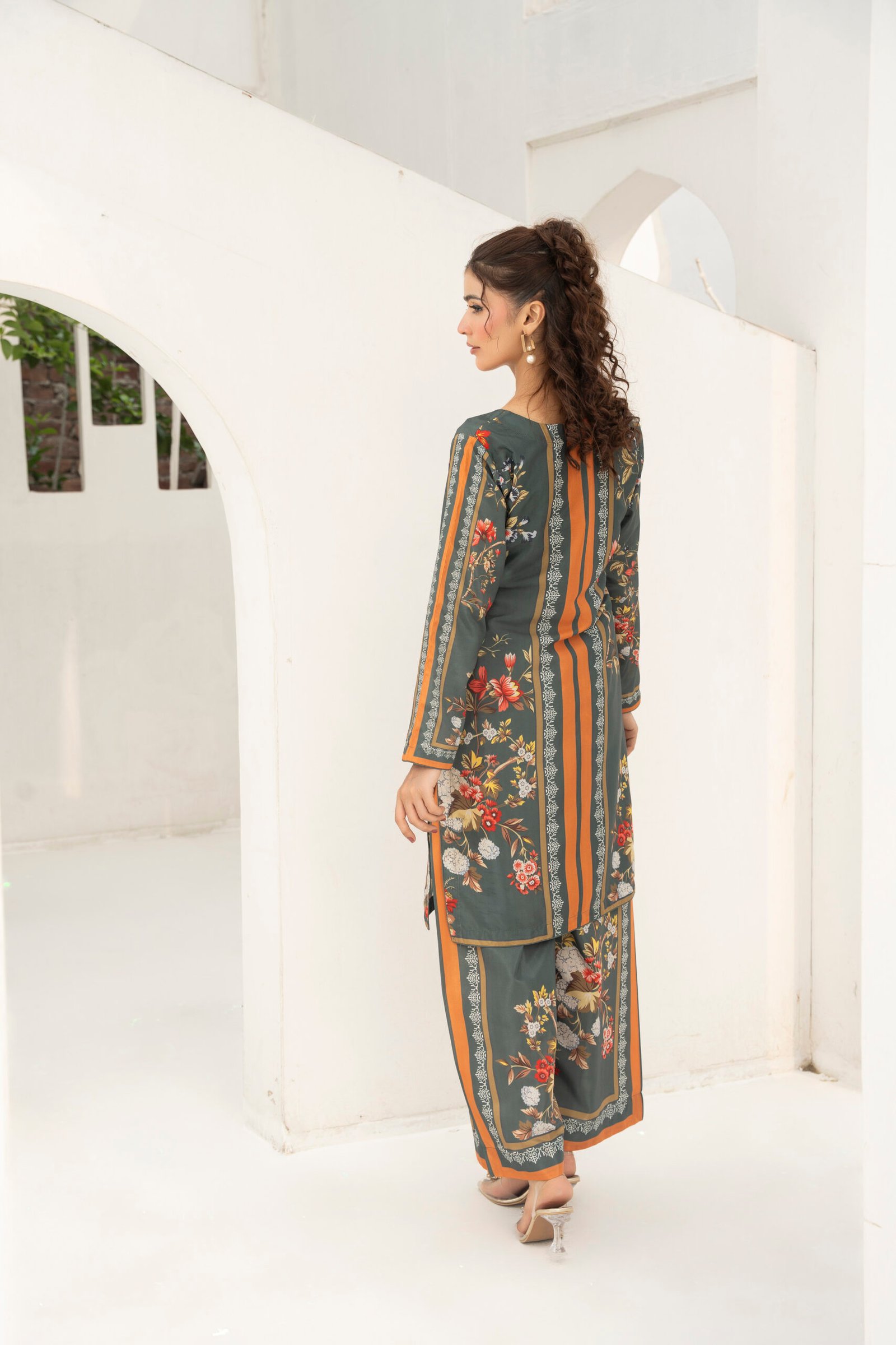 Presenting an exquisite piece from Nova collection, this silk co-ord set is a celebration of refined elegance and contemporary design. Crafted from premium silk, the ensemble features a rich muted green base adorned with vertical mustard-orange stripes, creating a visually elongating effect. Intricate floral motifs in vibrant hues of red, white, and yellow add a touch of artistry, blending tradition with modern flair.