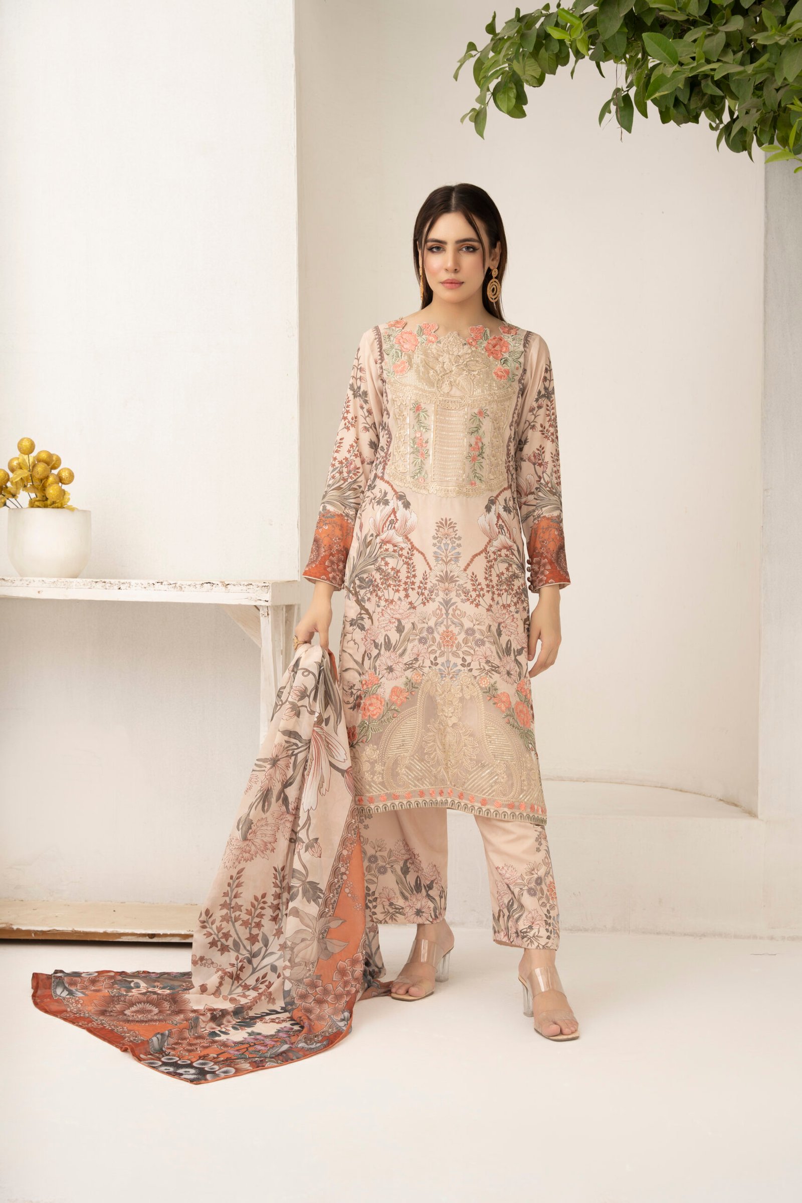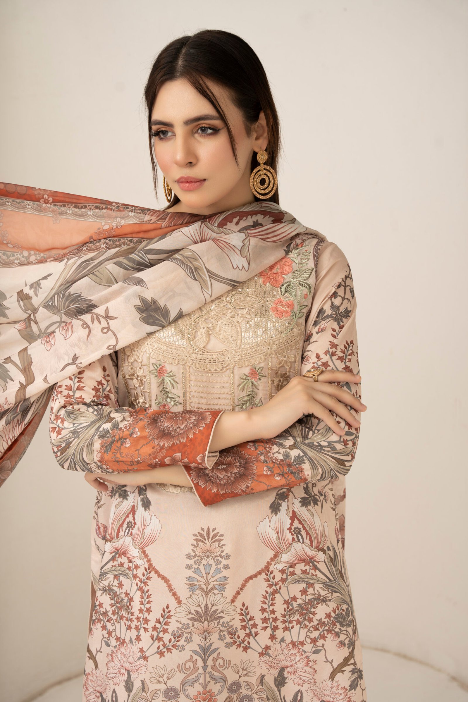 This sophisticated three-piece outfit features a straight-cut shirt and trousers crafted from premium grib fabric, offering a comfortable yet polished look. The shirt is adorned with intricate embroidery on the neckline, adding a touch of elegance and detail with subtle sequins. An embroidered patch at the bottom of the shirt further enhances its refined appeal. The matching trousers mirror the delicate print of the shirt, creating a cohesive and stylish ensemble.